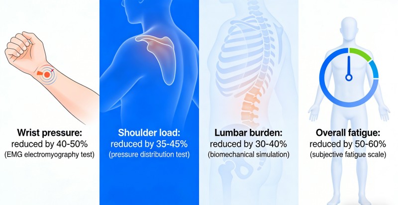 Reducerede belastningsrisici Håndledstryk: Reduceret med 40-50 % (EMG elektromyografi test) Skulderbelastning: Reduceret med 35-45% (trykfordelingstest) Nedre rygbyrde: Reduceret med 30-40 % (biomekanisk simulering) Generel træthed: Reduceret med 50-60 % (subjektiv træthedsskala)