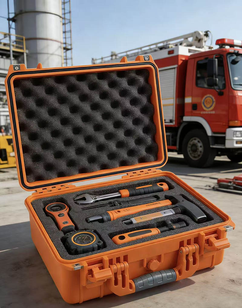 Brandslukningsspecifikt design Optimeret til de særlige behov for brandslukningsoperationer: Hurtig respons: Specielt låsedesign giver mulighed for hurtig åbning, selv når du bærer brandhandsker. Høj synlighed: Brandbekæmpende rød/fluorescerende orange farvesammensætning kombineret med reflekterende strimler for forbedret synlighed. Professionel identifikation: Understøtter tilpasning af brandslukningsemblemer, serienumre og funktionelle markeringer. Vandtæt og brandsikker: IP67-beskyttelse + flammehæmmende materialevalg, der kan tilpasses brandmiljøer.