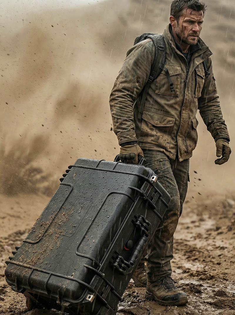 Mobilitets- og manøvreringssystem i industriel kvalitet: Flytning af sådan et kraftigt beskyttende etui kræver ægte industrielt design. Vi har udstyret det med et tilbagetrækkeligt trækstangsystem for mere stabil trækkraft; fire hjul med stor diameter, der er udstyret med lejer, placeret under trækstangen, sikrer sikkerhed på skråninger eller når de holder stille inde i et køretøj. Dette system gør det muligt for en enkelt person nemt at manøvrere en last på næsten 100 kg og flytte den lige så smidigt som en almindelig kuffert på fladt underlag.