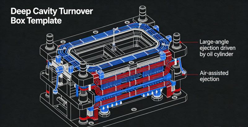 Udfordring: Stor volumen og tykke vægge af logistikcontainere resulterer i forlængede køletider, hvilket begrænser produktionskapaciteten. Løsning: Design flerlags serielle højhastighedskølekanaler, der tæt dækker alle tykvæggede områder. For beholdere med dybt hulrum skal du kombinere "hydrauliske cylinderdrevne skrå ejektorer med stor vinkel" med "gasassisteret udstødning" for at sikre jævn, hurtig udtømning af formen på minimal tid uden deformation eller vakuumadhæsion, hvilket minimerer produktionscyklusser.