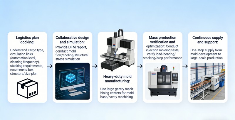 1. Logistikløsningsjustering: Forstå din lasttype, håndteringsstadier (f.eks. automatiseringsniveau, rengøringsfrekvens) og stablingskrav for at anbefale optimale containerstruktur- og størrelsesløsninger. 2. Samarbejdet design og simulering: Lever omfattende DFM-rapporter og udfør simuleringer af formflow, afkøling og strukturelle spændinger for at sikre optimale formløsninger i både ydeevne og omkostninger. 3. Heavy-Duty formfremstilling: Brug store portalbearbejdningscentre til at garantere præcision og stivhed ved bearbejdning af store formbaser og hulrum. 4. Masseproduktionsvalidering og optimering: Udfør kontinuerlig produktionstest på sprøjtestøbemaskiner for at validere kritiske ydeevnemålinger (bærende, stabling, faldtest) og afslutte processer. 5. Kontinuerlig forsyning og support: Vi tilbyder one-stop levering fra formudvikling til storskala sprøjtestøbningsproduktion, hvilket sikrer ensartet produktkvalitet og rettidig levering.