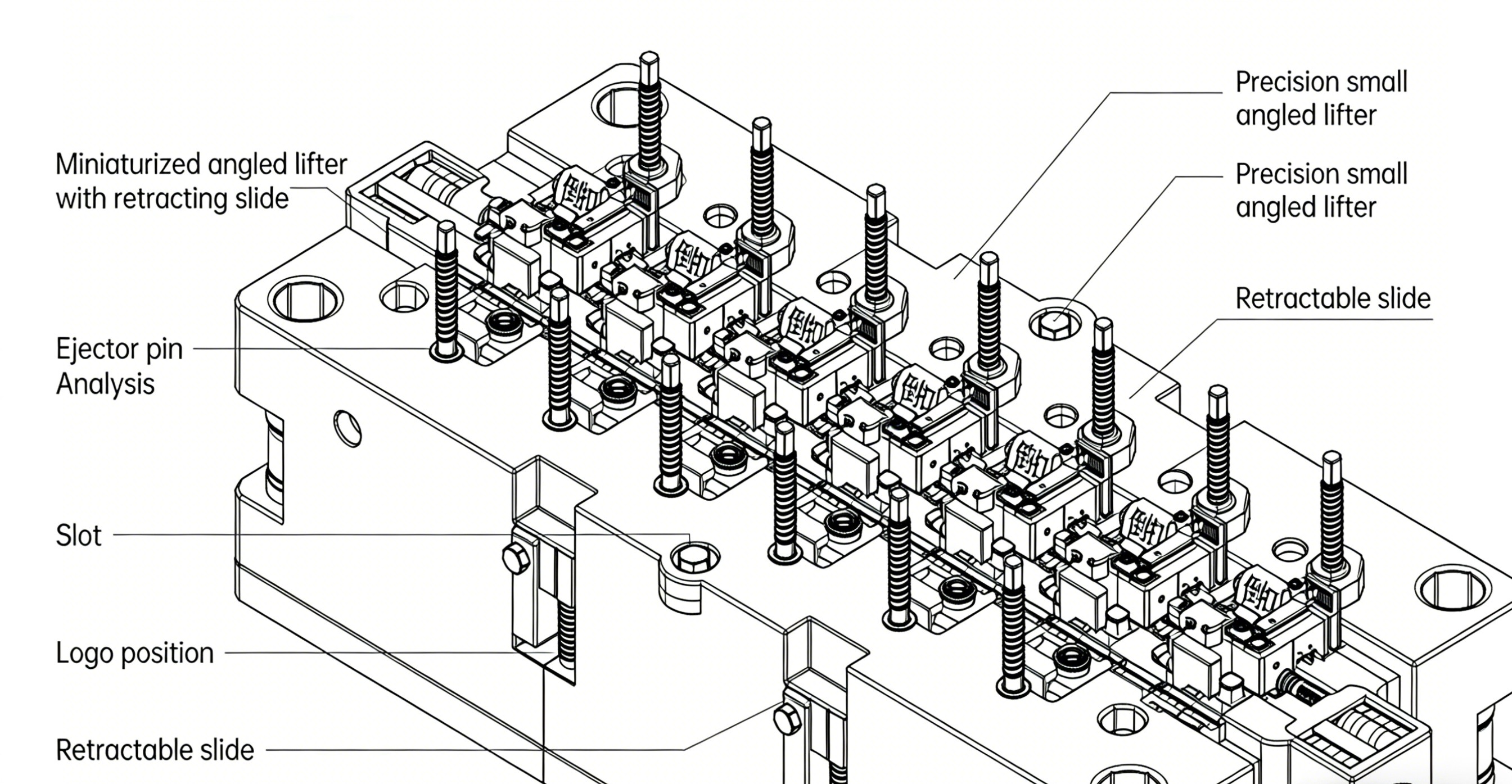 Udfordring: Interiøret byder på tætpakkede batterirumslåse, PCB-positioneringsstifter og dekorative slidsmekanismer, hvilket skaber komplekse strukturer, der er tilbøjelige til at blinke mærker, deformationer eller ridser under afformningen. Løsning: Design en "multi-gruppe mikro-tilspidset ejektor og tilbagetrækkelig skyder" kombinationsmekanisme. Kompakte præcisions mikro-tilspidsede ejektorer adresserer tætte interne underskæringer og ribber. Til sideslidser eller logopositioner sikrer tilbagetrækkelige skydere jævn udkastning uden produktskade. Ejektorstift-layoutet gennemgår stressanalyse for at garantere jævn, afbalanceret udkastning.