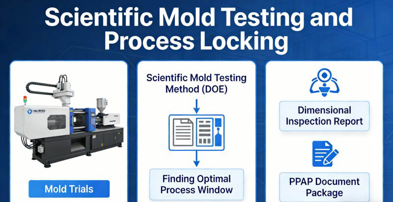 1. Hurtig prototyping & DFM: Vi leverer hurtig design gennemførlighedsanalyse (DFM) og prototyping anbefalinger baseret på dit koncept for at fremskynde design færdiggørelse. 2. Datadrevet formdesign: Anvendelse af professionel software til fuldt 3D-design med dybdegående simulering af flow, afkøling, strukturel styrke og forvridning for at opnå "nær-produktionskvalitet på det første formforsøg." 3. Præcisionsbearbejdning på mikronniveau: Ved at bruge præcisionsudstyr i temperaturkontrollerede værksteder sikrer vi kritiske dimensionstolerancer inden for ±0,02 mm. 4. Videnskabelig prøvestøbning og proceslåsning: Udfør prøvestøbning på vores højhastighedspræcisionssprøjtestøbemaskiner. Anvend Design of Experiments (DOE) til at identificere optimale procesvinduer og levere omfattende dimensionelle inspektionsrapporter og PPAP-dokumentationspakker. 5. Produktionssupport og kontinuerlig optimering: Vi yder masseproduktionssupport på stedet og udfører løbende optimering baseret på produktionsdata, og tilbyder tekniske anbefalinger til produktopgraderinger og omkostningsreduktion.